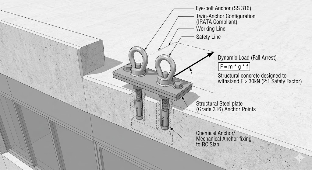 Kapasitas Beban: Berdasarkan standar internasional (seperti IRATA atau EN 795), setiap titik anchor permanen harus mampu menahan beban statis minimal 15 kN (sekitar 1,5 ton).