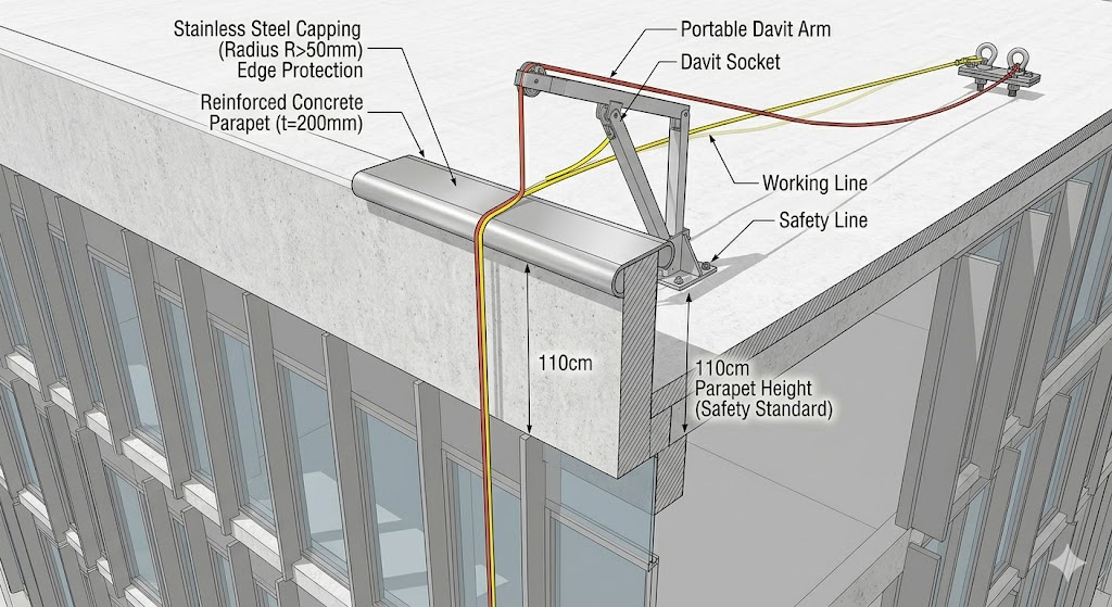 Stainless Steel Capping: Pinggiran parapet dilengkapi dengan capping atau pelindung sudut yang halus dan membulat (radius R>50mm). Ini sangat penting untuk mencegah tali aus akibat gesekan dengan sudut tajam beton saat menahan beban.