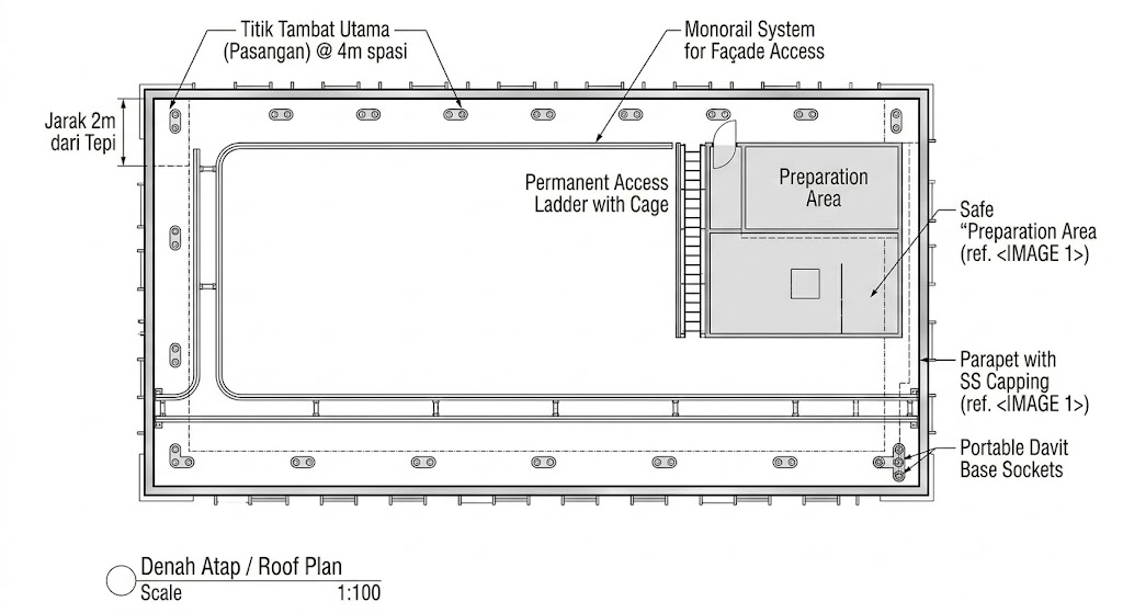 Jarak dari Tepi: Titik-titik anchor utama diletakkan di sepanjang perimeter, berjarak sekitar 2 meter dari tepi parapet (seperti yang disarankan). Ini memberikan ruang bagi teknisi untuk melakukan manuver sebelum turun.