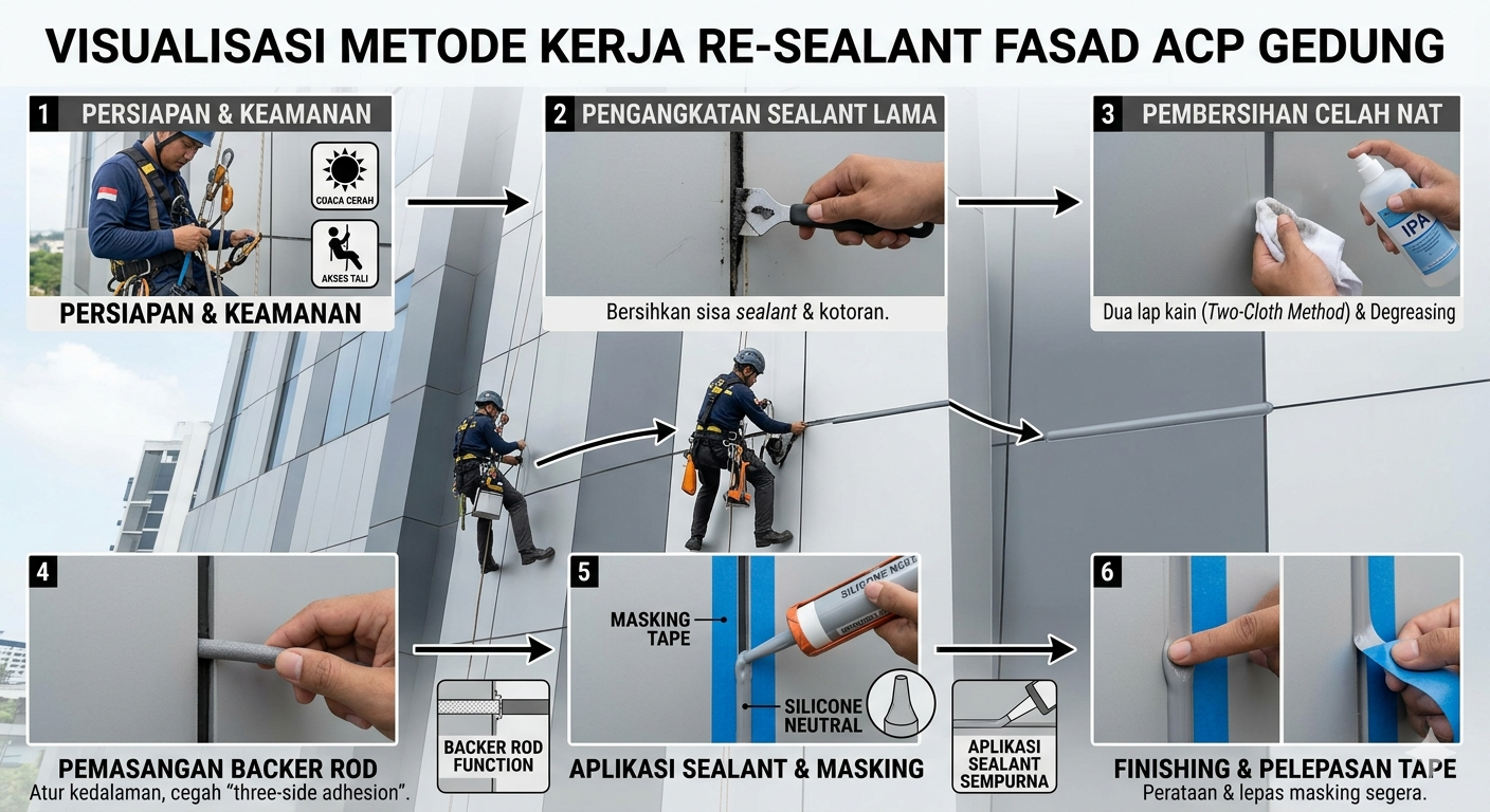 Pekerjaan re-sealant pada fasad ACP (Aluminium Composite Panel) memerlukan ketelitian tinggi untuk memastikan kekedapan air (waterproofing) dan estetika bangunan tetap terjaga.