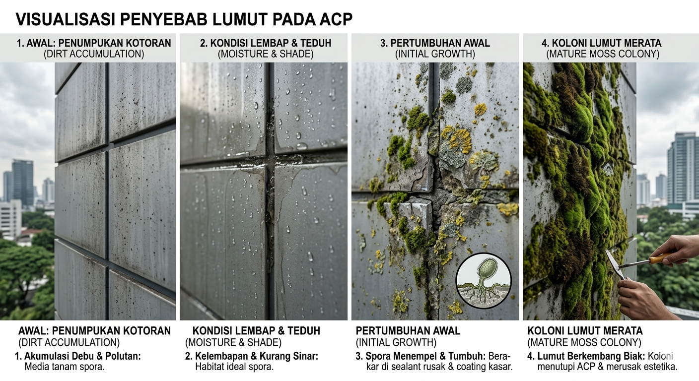 Debu, asap kendaraan, dan polutan udara yang menempel pada permukaan ACP bertindak sebagai media tanam bagi spora lumut. Jika permukaan ACP tidak dibersihkan secara rutin, debu ini akan menumpuk dan membentuk lapisan tipis yang menahan kelembapan.