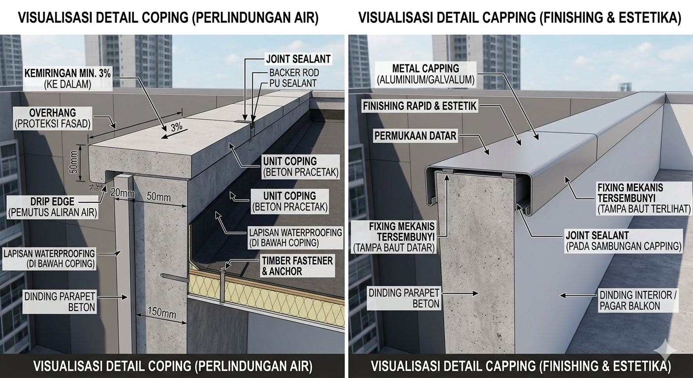 Berikut adalah visualisasi teknis yang membandingkan detail Coping dan Capping pada dinding parapet gedung.