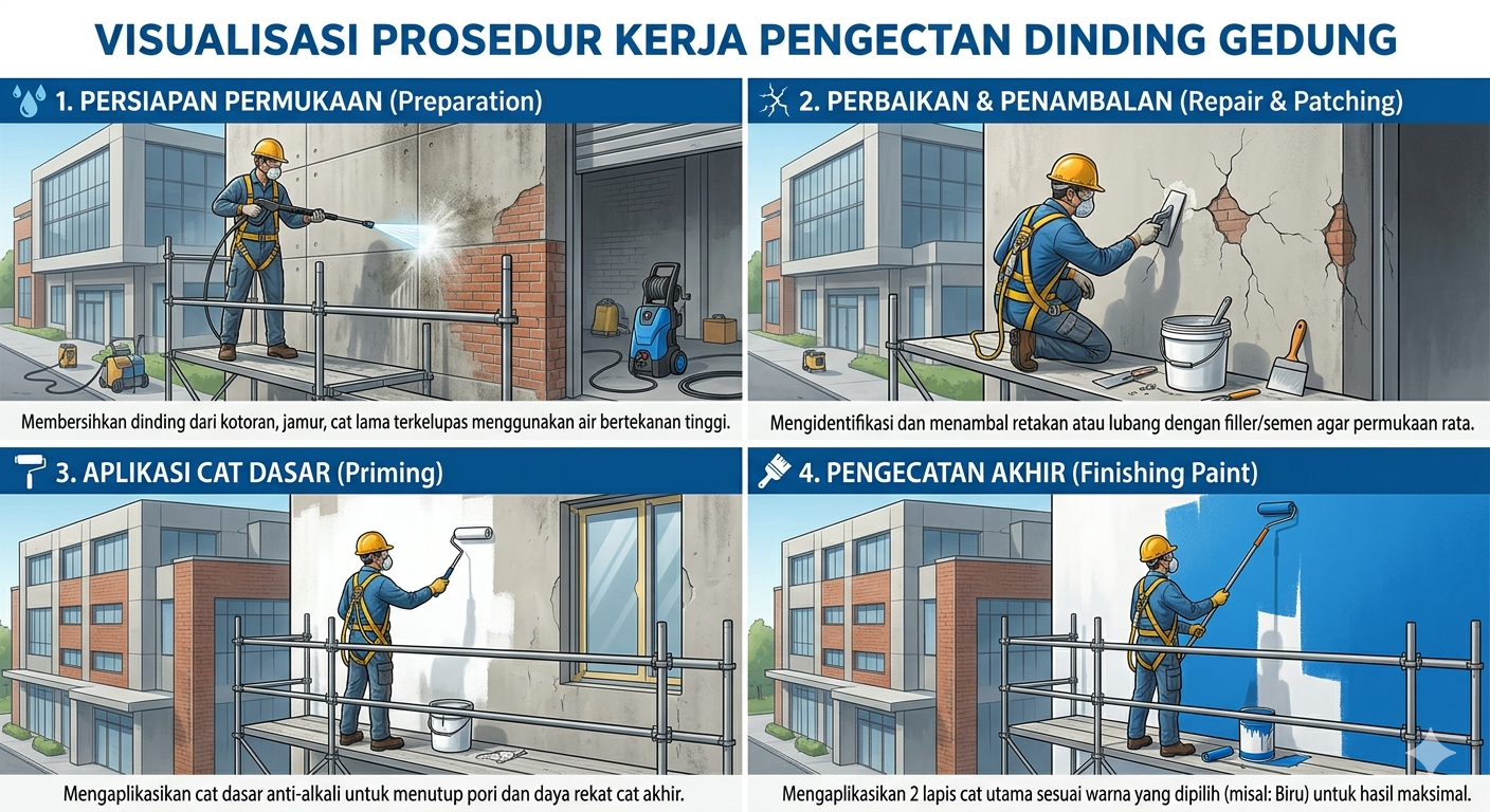 Keamanan (K3): Untuk gedung tinggi, pastikan pekerja menggunakan alat pelindung diri (APD) lengkap seperti harness (tali pengaman), helm, dan menggunakan perancah (scaffolding) atau gondola yang teruji keamanannya.
